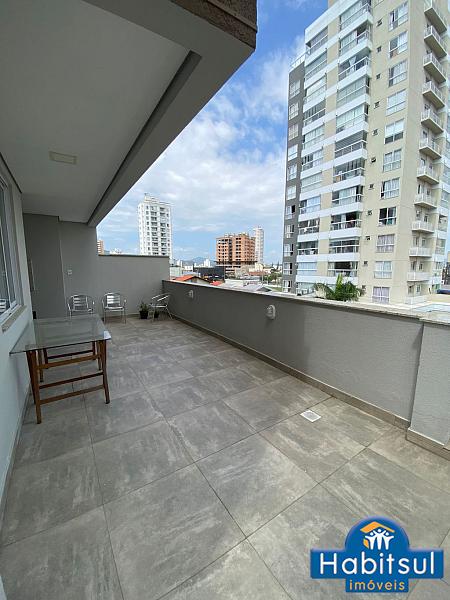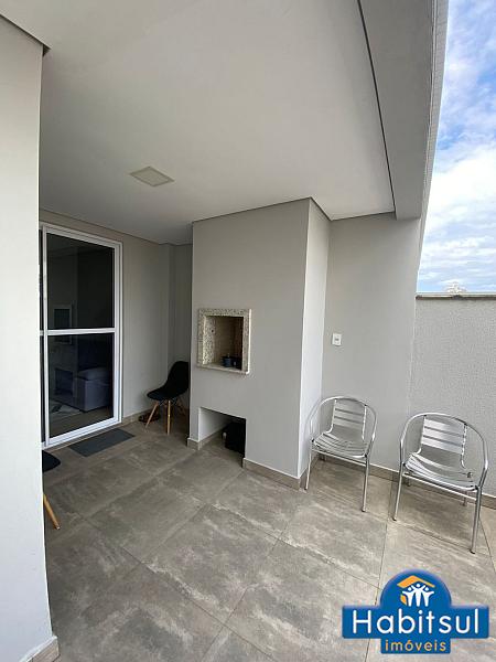 sacada com churrasqueira a carvão e um amplo terraço externo com possibilidade de fechamento